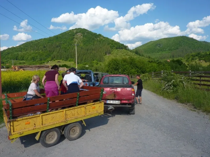 - Adunarea se face (conform înțelegerii personale cu conducătorul programului) la intrarea în localitatea Sub Cetate (dinspre Odorheiu Secuiesc), în locul de parcare desemnat, lângă drumul asfaltat. Un SUV vechi Land Rover se află la punctul de întâlnire.