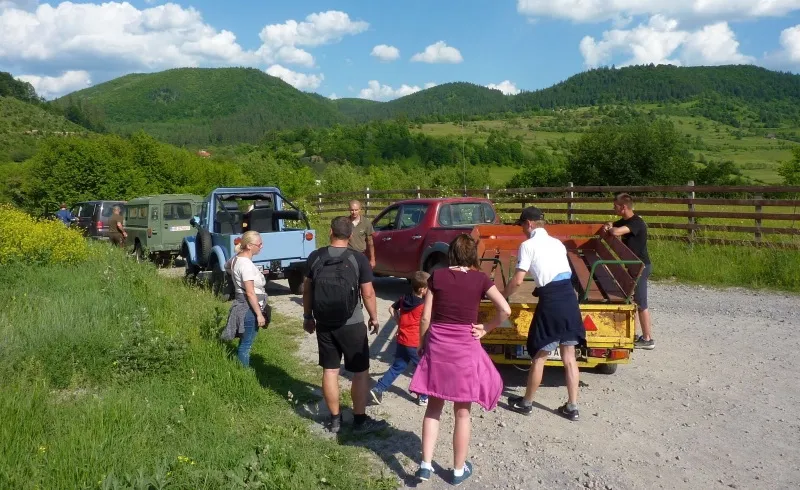 - Oaspeții își lasă mașinile in parcare si sunt invitați sa ocupe loc in mașina organizatorului. Participanții sunt transportați de organizator aproape (la 2 km) de punctul de observare al ursului (clădire moderna si solida).