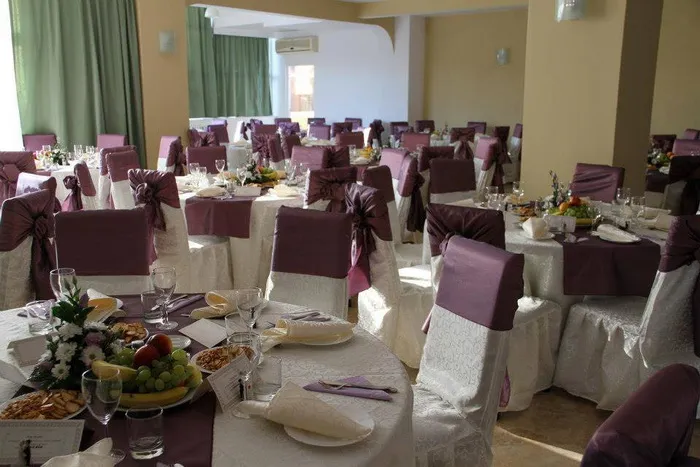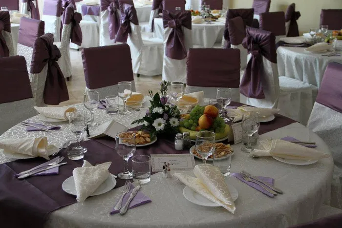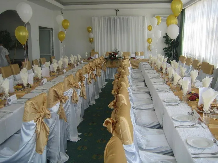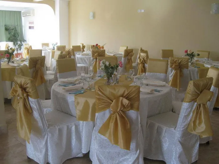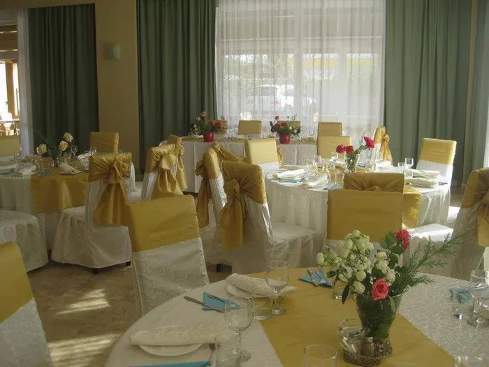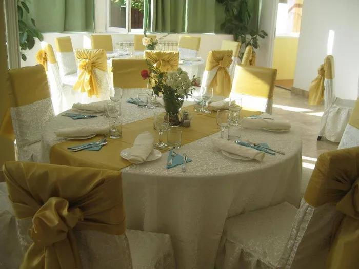 aranjarea si decorarea festiva a meselor si scaunelor cu huse si funde din organza