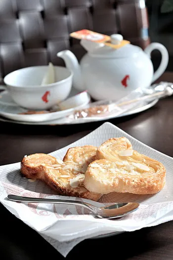 In componenta acestuia avem: cafea, ceai, lapte, apa minerala/plata, suc de portocale si cereale la discretie, cat si croissant, iaurt, branza topita, pate din ficat de pui, fruct de sezon, un produs de patiserie, chifla, unt, gem si miere de albine.