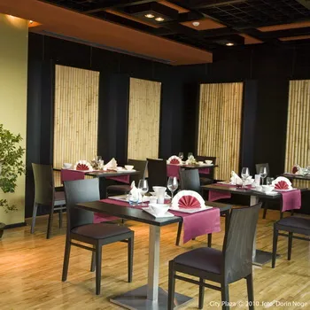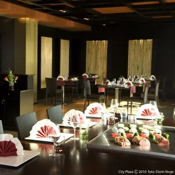 Restaurant Ken Sai - Cu o priveliste vasta si surprinzatoare asupra orasului si Parcului Central, de la nivelul sase al hotelului, Restaurantul Ken Sai aduce meniuri specifice japoneze si doua mese de gatit teppanyaki, dar si preparate originale vietnameze, fiind unicul restaurant cu acest specific din Transilvania.