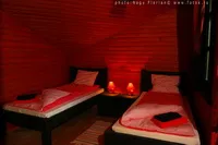 Toate cele patru casute au doua camere duble cu bai proprii: