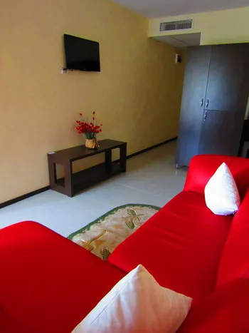 camera de living ce are in dotare o canapea extensibila (spatioasa pentru odihna a doua persoane), sifonier, doua fotolii cu masuta, televizor cu plasma, birou, comoda;