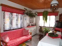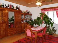 Casa este amenajata in stil rustic, traditional, cu mobila sculptata.