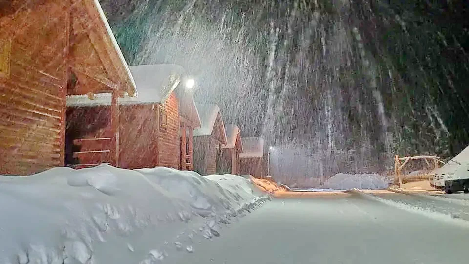 In timpul iernii, schi (partia de schi este la 100m distanta)