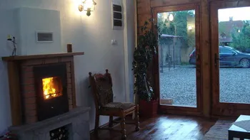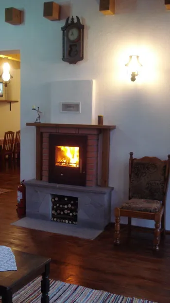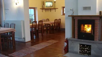 Camera de zi / sufragerie spatioasa cu 20 de locuri, dotata cu semineu, TV, toaleta cu chiuveta.