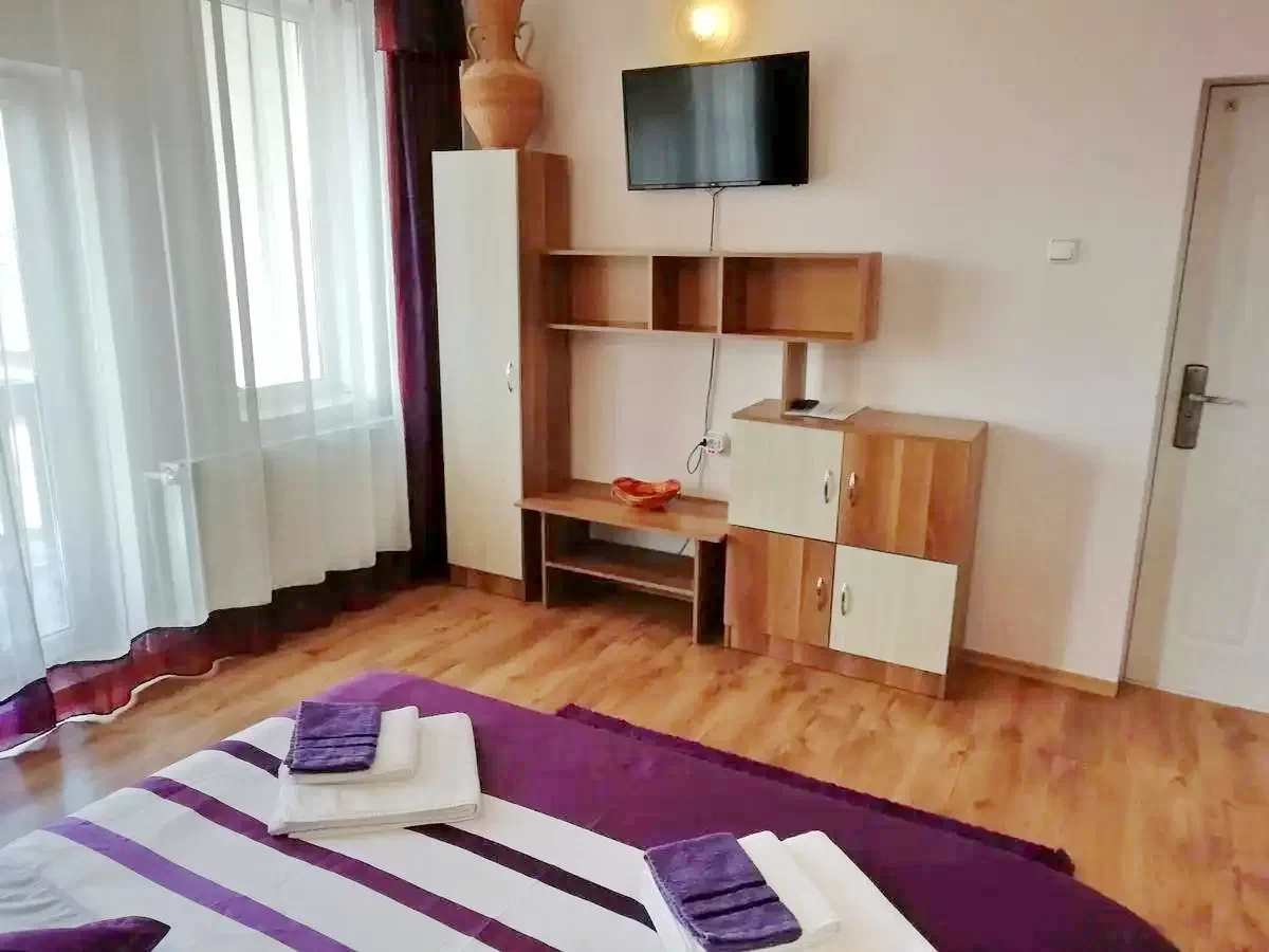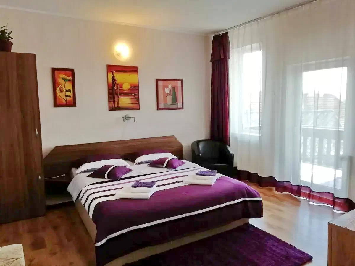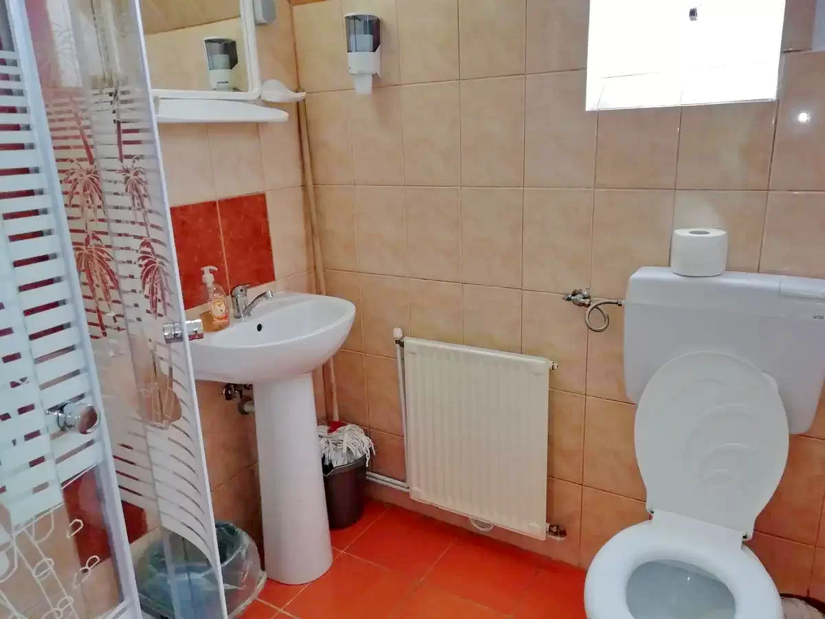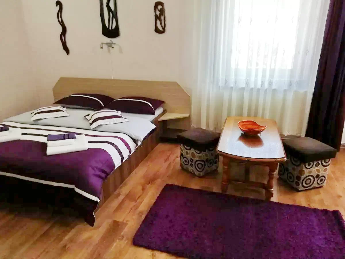 Pensiunea dispune de un apartament compus din 2 camere cu baie si bucatarie proprie, 6 camere cu pat matrimonial dotate cu TV, cablu TV si baie proprie, bucatarie dotata si utilata, living.